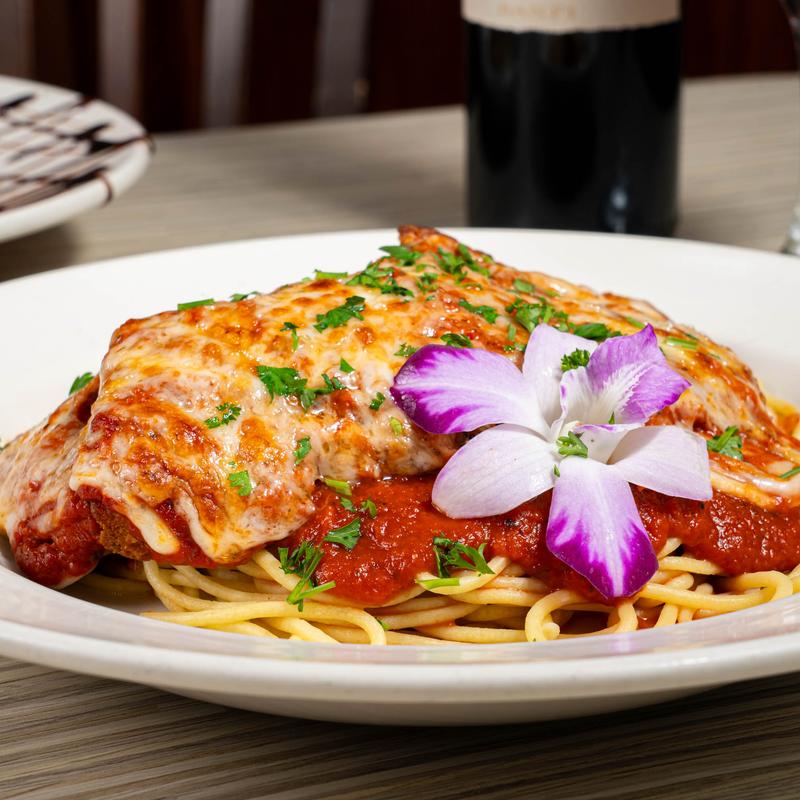 Lunch $15.00 | Dinner $20.00 • Breaded and fried with marinara sauce and mozzarella cheese, then baked with scratch made spaghetti