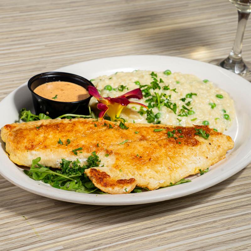 Pan cooked with herbs and lemon. Served with pea and parmesan risotto