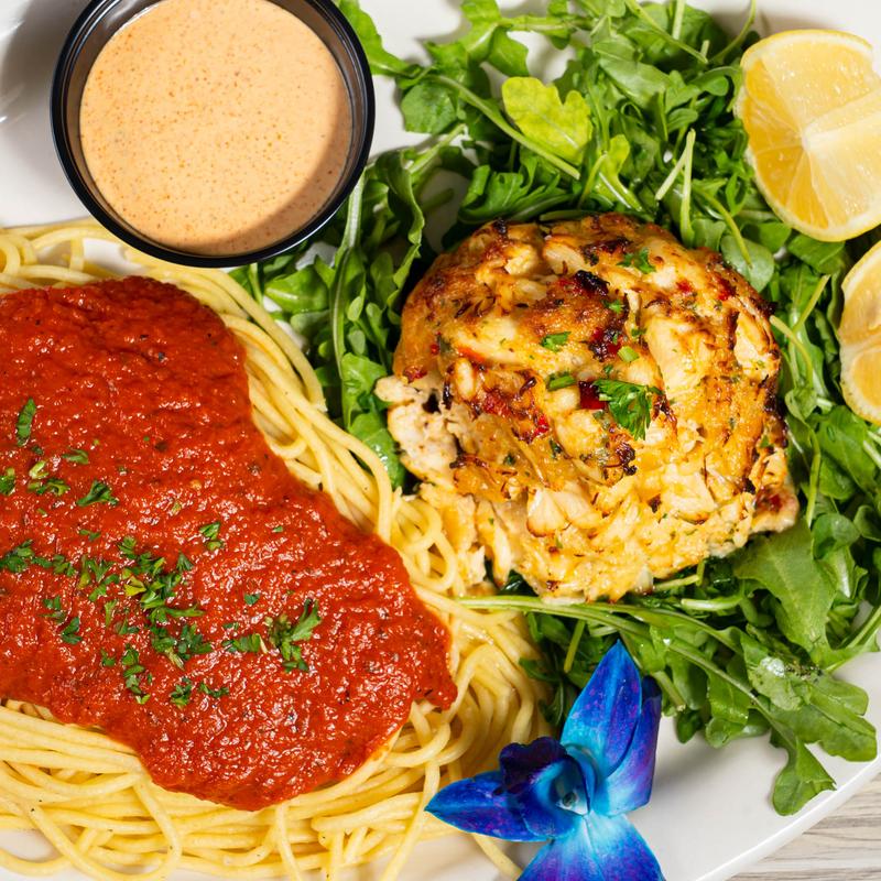 A perfectly seasoned crab cake, broiled with a side of scratch pasta with marinara sauce